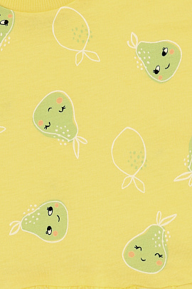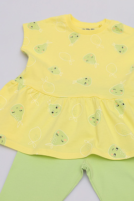 Комплект для девочки: туника из мягкого трикотажа с принтом в виде груш и бриджи. Туника расклешенного силуэта со спущенным плечом. Горловина круглая, оформлена кашкорсе. На плече застежка на кнопки. Бриджи однотонные, пояс на резинке.