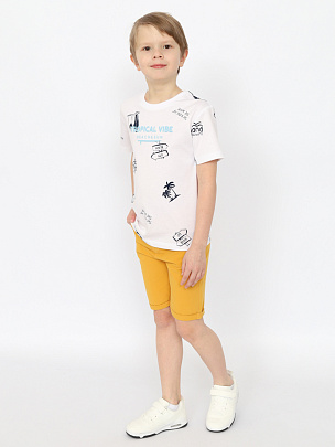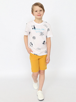 Футболка для мальчика с коротким рукавом из набивного полотна. Горловина обработана притачной бейкой из рибаны с лайкрой. Перед декорирован принтом.