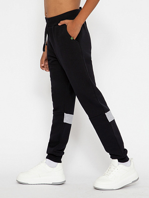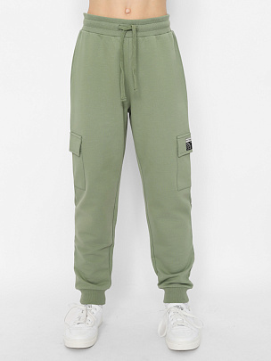 Брюки с притачным поясом и манжетами. В пояс вставлена резинка и функциональный шнур. Пояс и манжеты выполнены из полотна с эластаном. На боковых швах расположены накладные карманы с клапаном. Карман декорирован вязаной нашивкой.