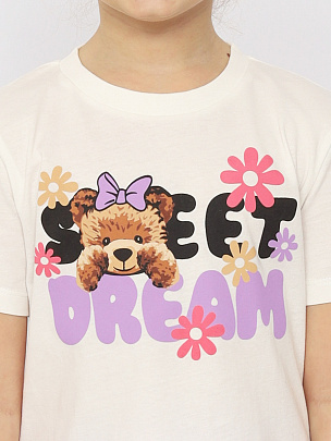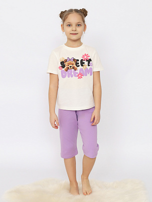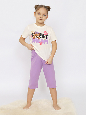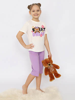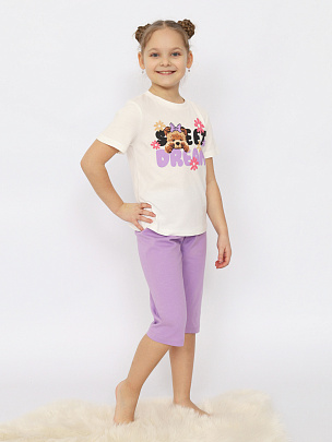 Пижама гладкокрашенная из футболки и бридж. Футболка свободного покроя с коротким рукавом. Горловина обработана притачной бейкой из рибаны с лайкрой. Перед оформлен принтом. Бриджи прямые умеренного объёма длиной ниже колена выполнены из полотна дополнительного цвета. Цельнокроенный пояс обработан плоским швом вподгибку с одновременным прокладыванием резинки.