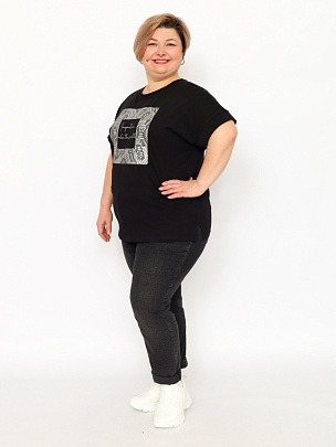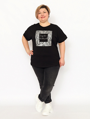 Футболка прямого силуэта удлиненная. Короткий цельнокройный рукав. Круглая горловина обработана узкой притачной обтачкой из рибаны с эластаном. Полочка декорирована принтом с использованием красок с блеском "воображение правит миром". Разрезы по бокам.