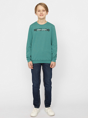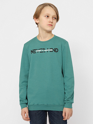 Джемпер для мальчика с контрастными вставками вдоль боковых швов и по рукавам. Рукава с манжетами по низу. Горловина круглая, обработана узким воротником из полотна с эластаном. Перед джемпера декорирован принтом.