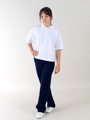 Джемпер-поло из пике для девочки, с короткими рукавами, свободного силуэта, спущенным плечом и отложным воротником. Спереди застежка на пуговицы. Декорирован вышивкой.