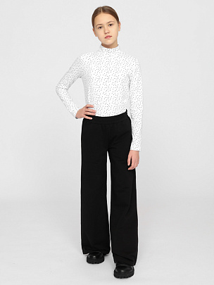 Джемпер для девочки с длинными рукавами и отложным воротником из кулирки, свободного силуэта. Рукава объемные, со спущенным плечом, снизу манжет из кулирки. Спинка с вырезом-капелькой и застёжкой на пуговицу-бусину с петлёй.
