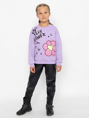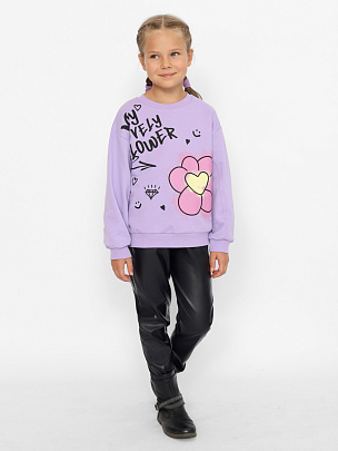 Джемпер для девочки с модным, трендовым принтом в стиле граффити (надпись: "Мой прекрасный цветок"). Крой оверсайз с заниженной линией плеча не сковывает движения, позволяя ребенку быть активным. Модель дополнена круглым вырезом горловины и длинными рукавами. Воротник, манжеты и пояс выполнены из полотна с эластаном.