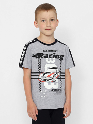 Футболка с коротким рукавом. Горловина круглая, обработана узким воротником из полотна с эластаном. Перед оформлен шрифтовым принтом.